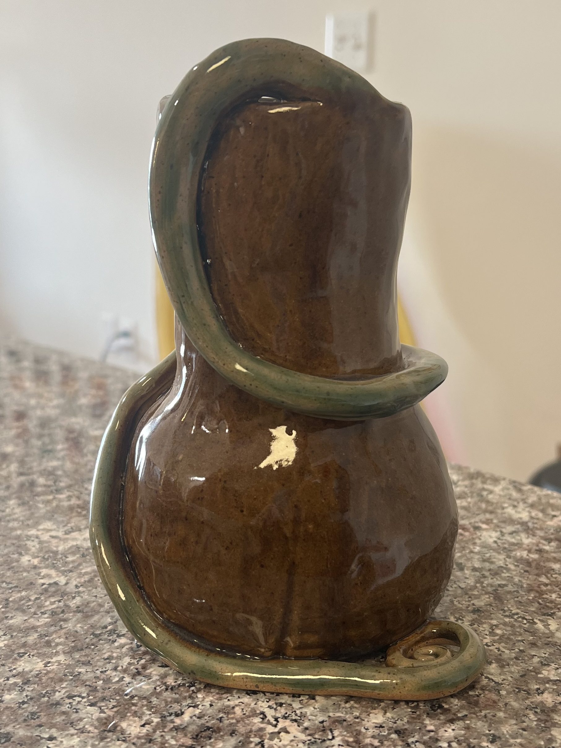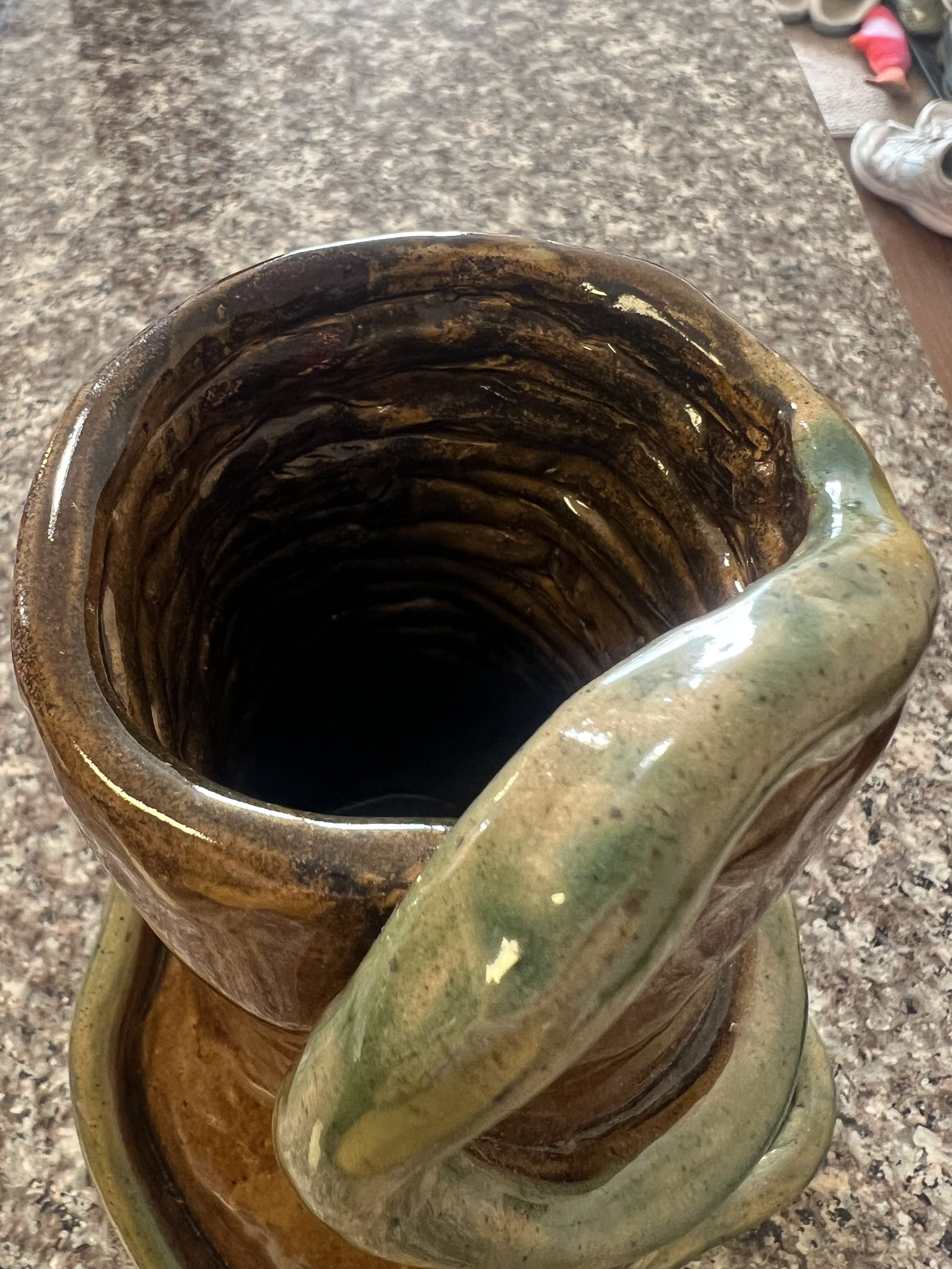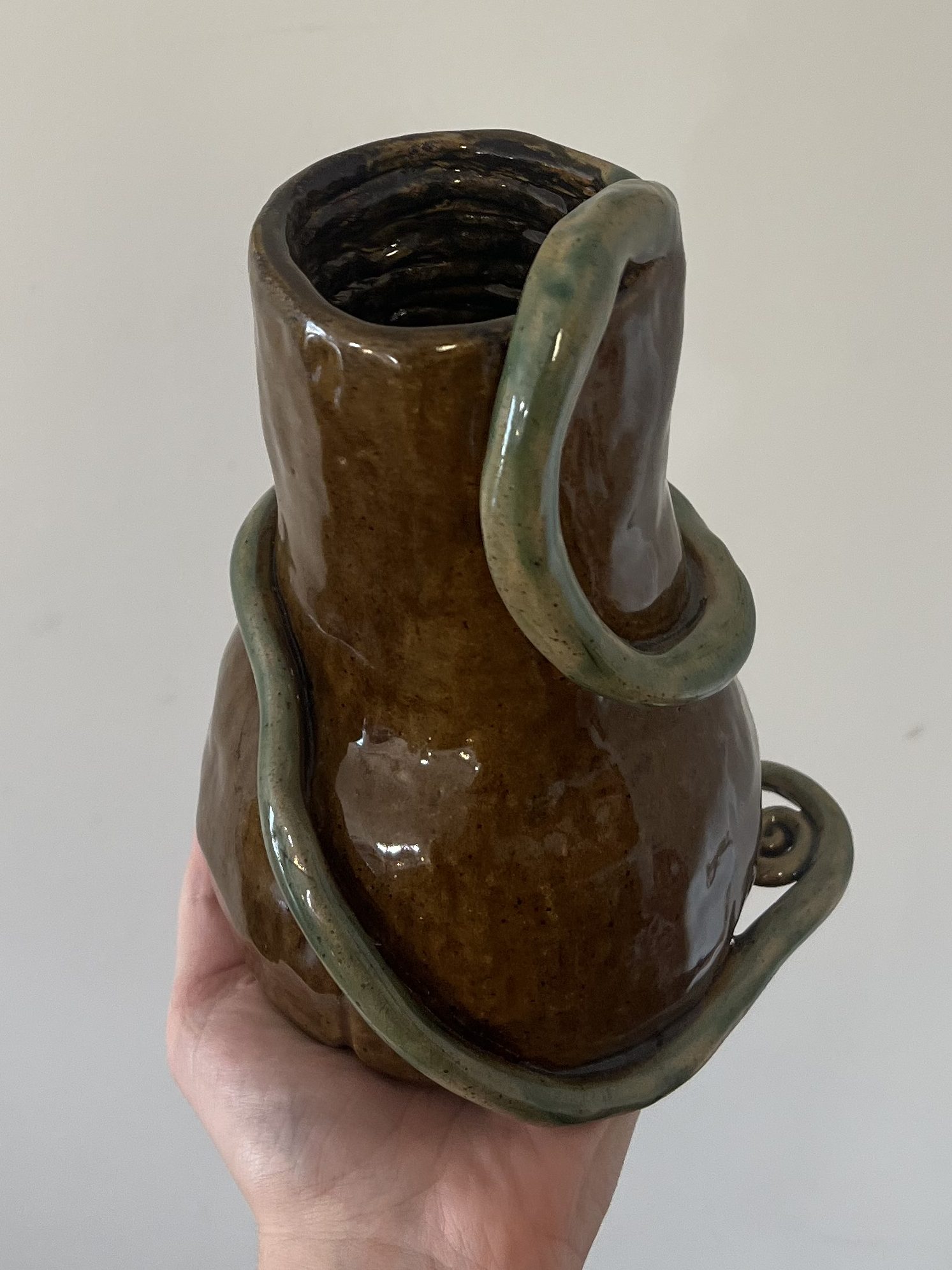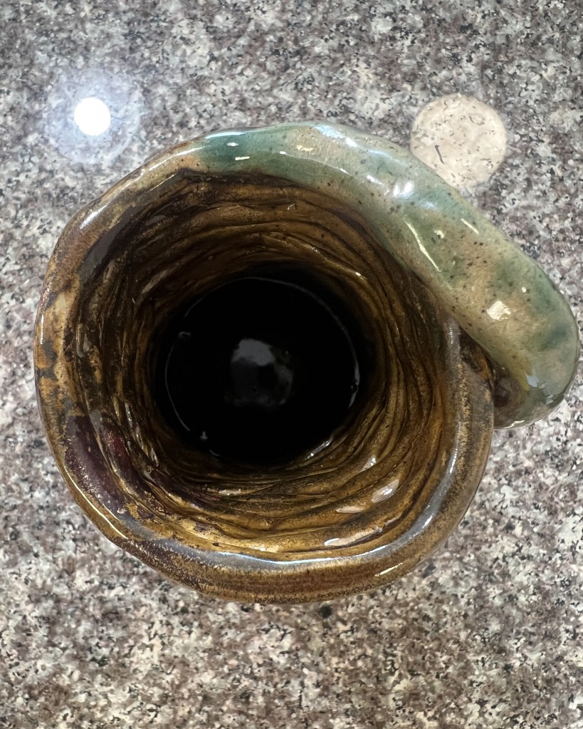 I love the texture on this piece from smoothing the outside with my hands, and the way that the transparent glazes show all of the little details. I also love the way that the coiling looks on the inside of the vase because I didn’t smooth it out. It reminds me of Uzumaki by Junji Ito.