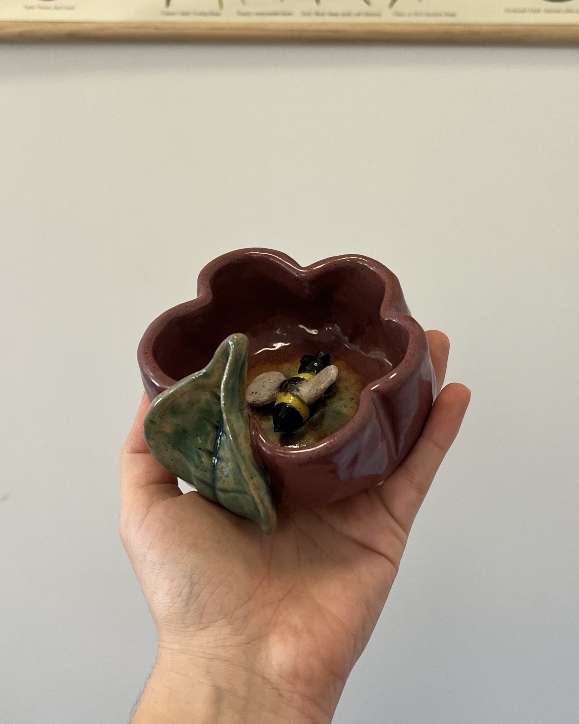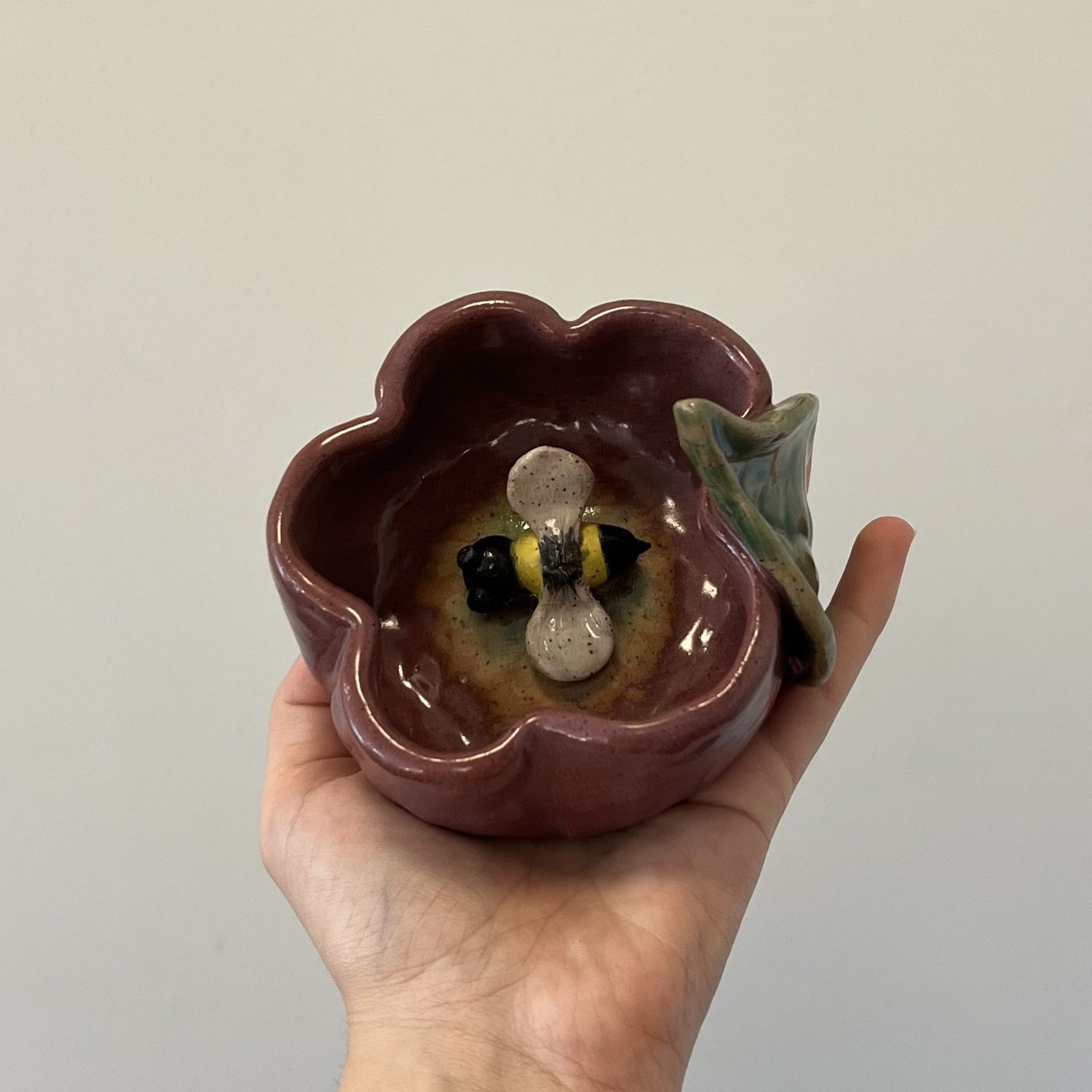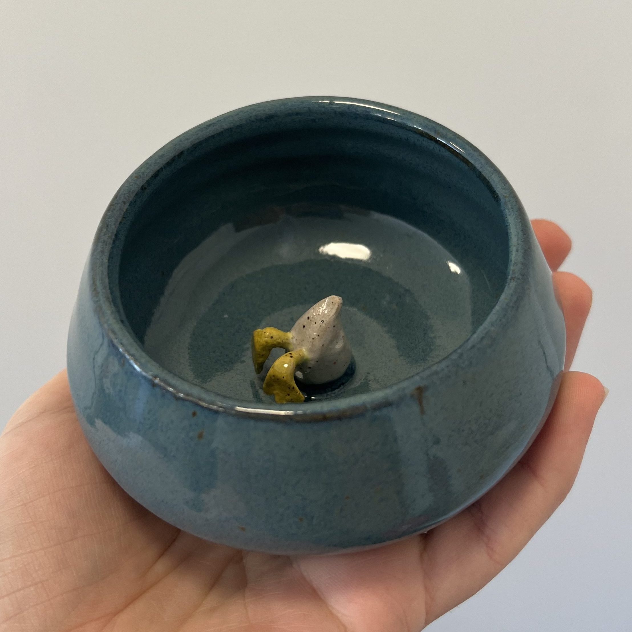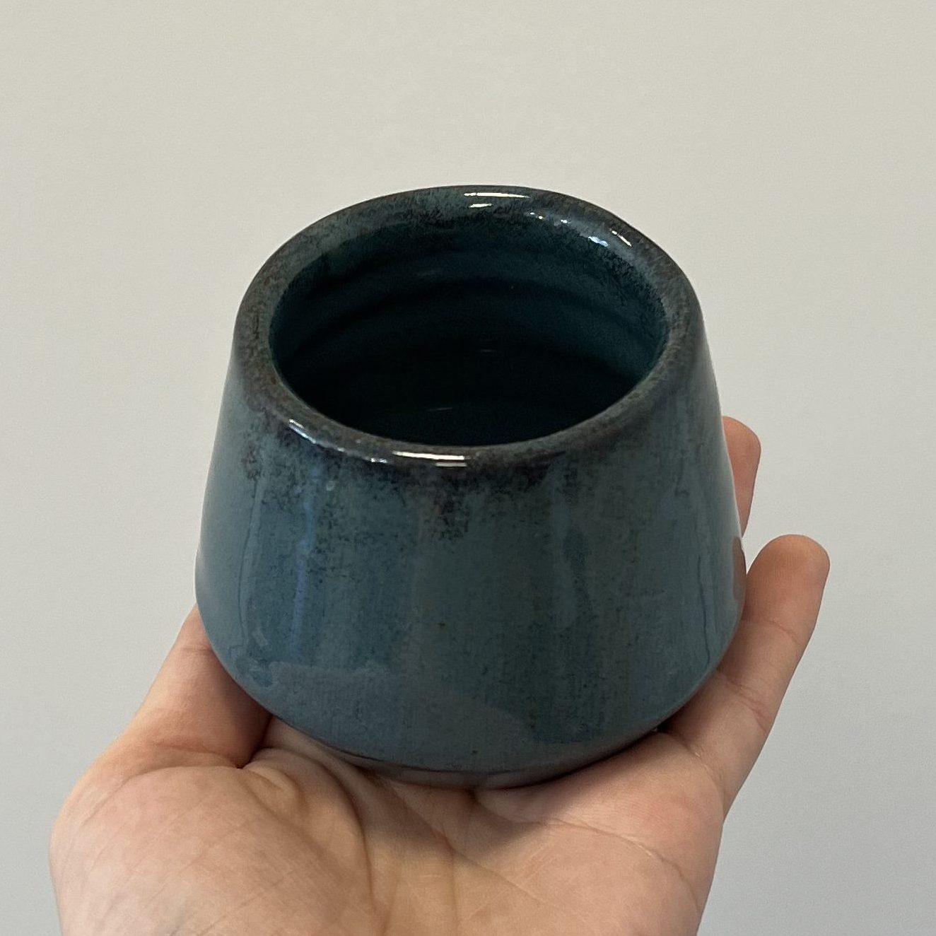 I love the texture on this piece from smoothing the outside with my hands, and the way that the transparent glazes show all of the little details. I also love the way that the coiling looks on the inside of the vase because I didn’t smooth it out. It reminds me of Uzumaki by Junji Ito.