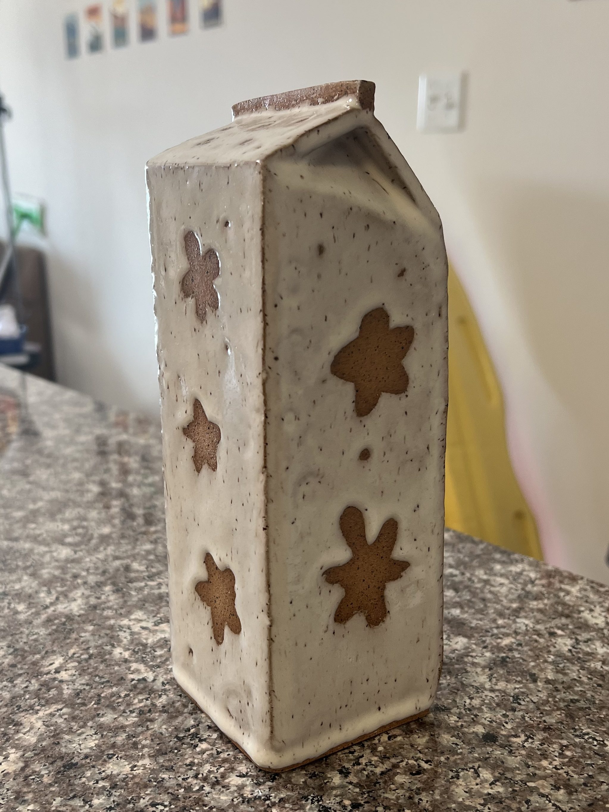 This is the first time I used wax resist to create patterns in my glaze. If I had experience with this glaze before, I would have probably tried a different style of glazing. With the way the speckles in the glaze look like they are running down the piece, I think I would have tried to make a dripping pattern, so that it looked like melted vanilla bean ice cream dripping down the piece.
